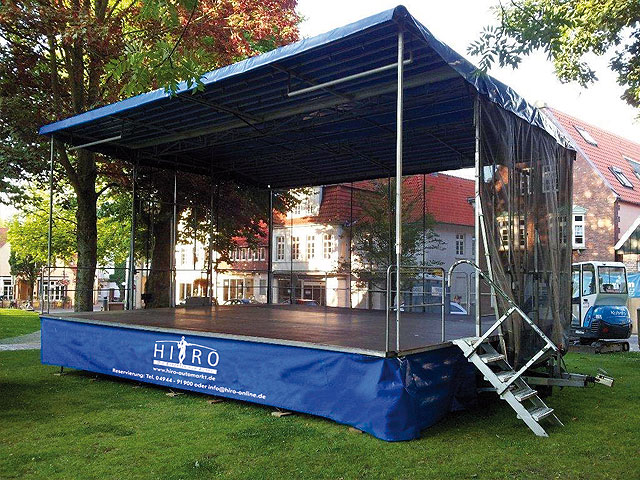 Unsere mobile Bühne ist für Einsätze im Aussenbereich entwickelt worden, wo es darum geht, mit möglichst geringem Aufwand an Zeit, Personal und Material ein überdachtes Podium zu errichten. Bevorzugte Einsatzmöglichkeiten der mobilen Bühne von HIRO sind Stadt- und Strassenfeste, Open-Air- Veranstaltungen, Produktpräsentationen, Gewerbeschauen usw. ... und überall dort, wo sie vom Wetter unabhängig ihre Veranstaltung über die Bühne bringen möchten. Und das alles günstiger als jedes herkömmliche Bühnensystem!